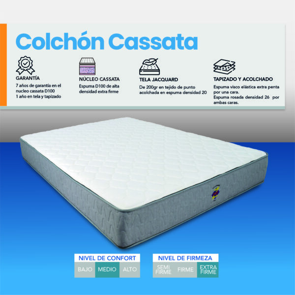 Tela yacard con diseño de tejido de punto y tratamiento anti ácaros + núcleo en espuma cassata densidad 100 + sistema de pilow top interno por un lateral en 2 cm + espuma en densidad 26 por ambos laterales para disminuir los puntos de presión + sistema de cierre en su tela y sujetadores laterales + garantía en estructura es de 7 años y 1 año en tela y tapizado. (consultar condiciones de garantía)